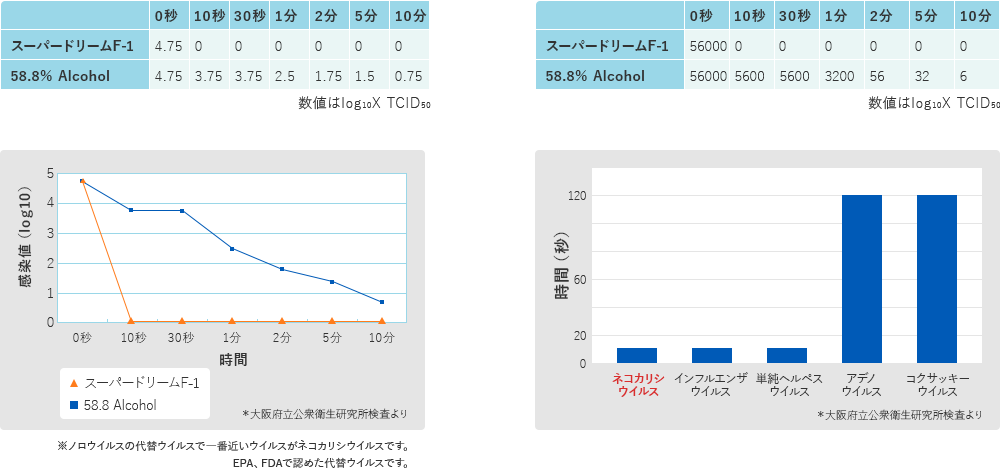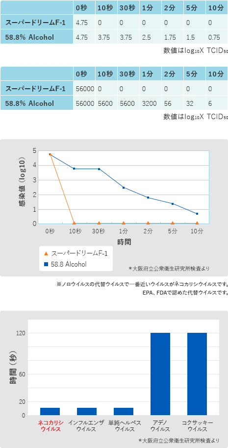 衛生研究所に試験を依頼した結果、スーパードリームF-1はネコカリシウイルスを噴霧後から10秒以内に完全に不活化することに成功しました。