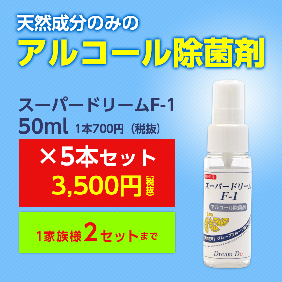 スーパードリームF-1は除菌に有効なばかりでなく、 頻繁に使う方にも安心です。また、スーパードリームF-1に使用しているグレープフルーツ種子抽出液は食品添加物として認められておりますので口に入っても問題はありません。 (弊社では食品への直接の噴霧はお勧めしておりません)